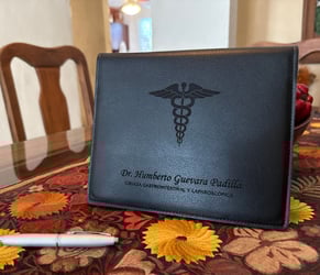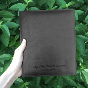 Elegante porta recetario médico vertical en piel genuina personalizado.