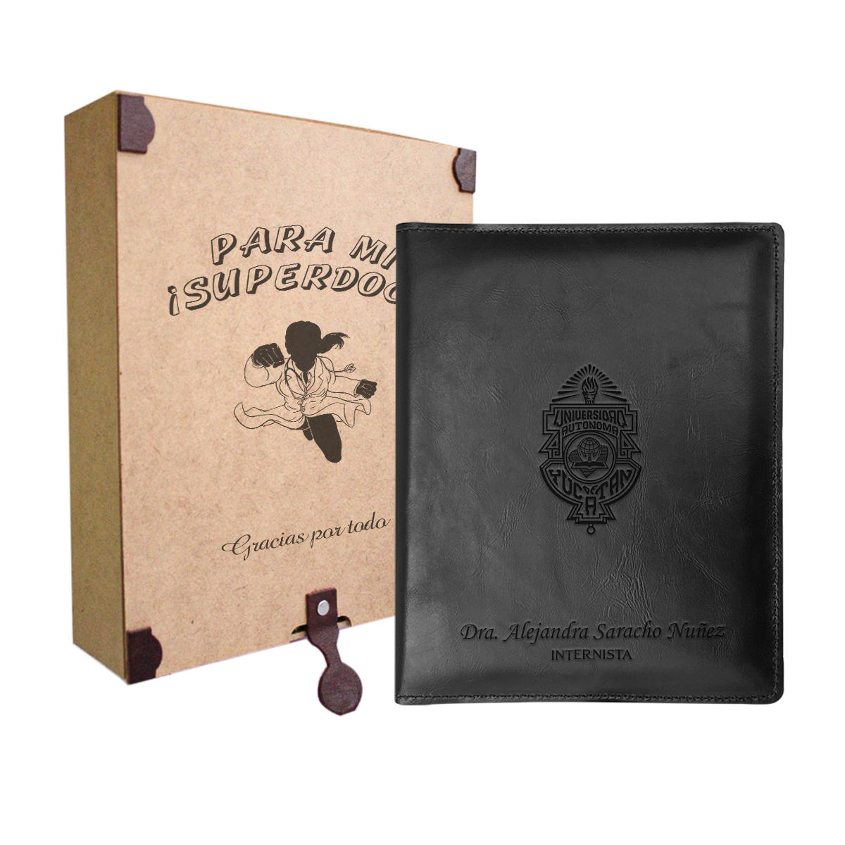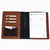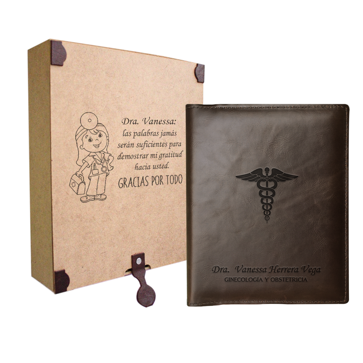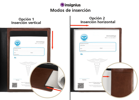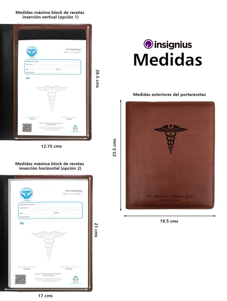 Funda para recetarios médicos tamaño media carta vertical fabricada en piel sintética importada tipo Cordovan de alta calidad, con un diseño profesional y espacios para tarjetas de presentación.
