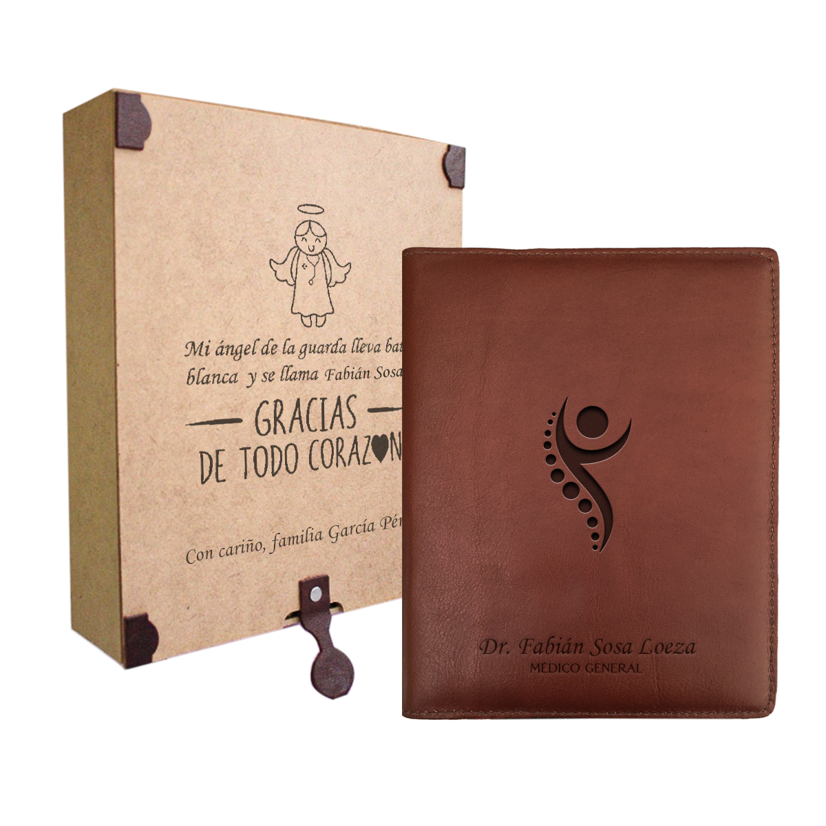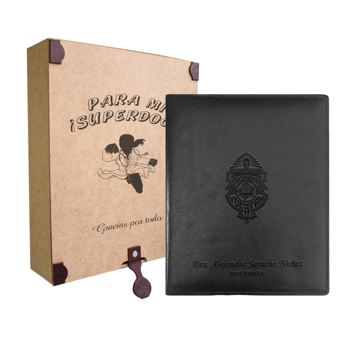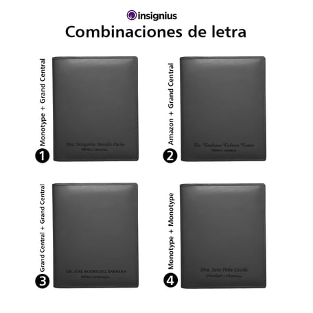 Funda para recetarios médicos tamaño media carta vertical fabricada en piel genuina de alta calidad, con un diseño profesional y espacios para tarjetas de presentación.
